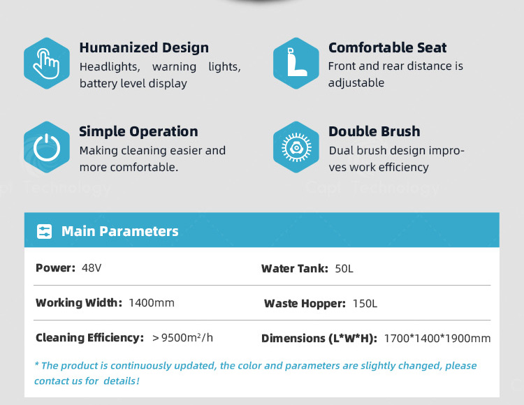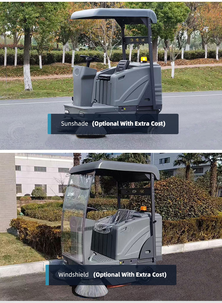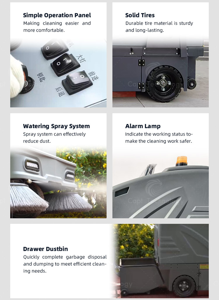 This riding sweeper is mainly suitable for places with flat ground and relatively good environment, such as municipal roads, property communities, airports, enterprises, large garages, colleges and universities, and high-end villa areas.
