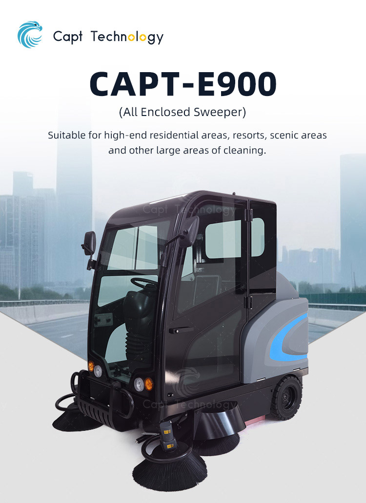 CAPT-E900 enclosed sweeper adopts fully enclosed cab design, and it is mostly suitable for using in extremely cold and harsh environment. Mostly for outdoor use, suitable for high-end residential areas, resorts, scenic areas and other large areas of cleaning.