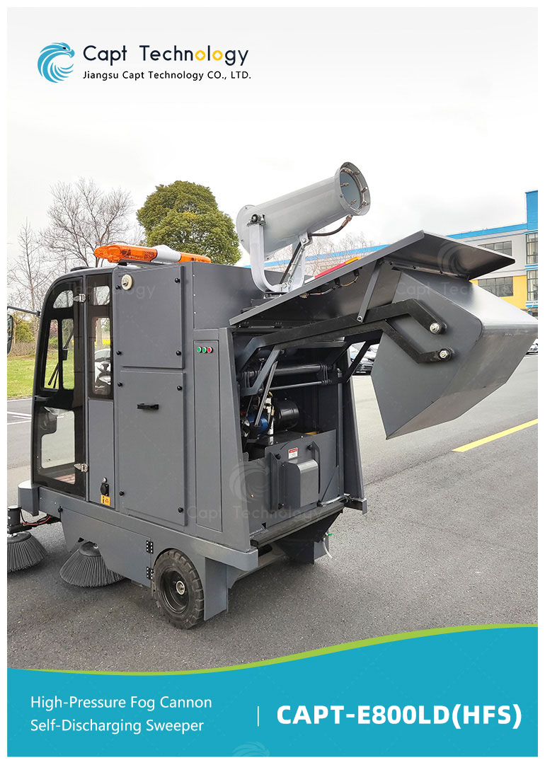 CAPT-E800LD(HFS) high-pressure fog cannon self-discharging sweeper integrates cleaning, remote control fog cannon and hand-held high pressure water gun in one, which can cleaning garbage, spray cooling, dust removal and dust suppression, spray disinfection and other work at the same time.