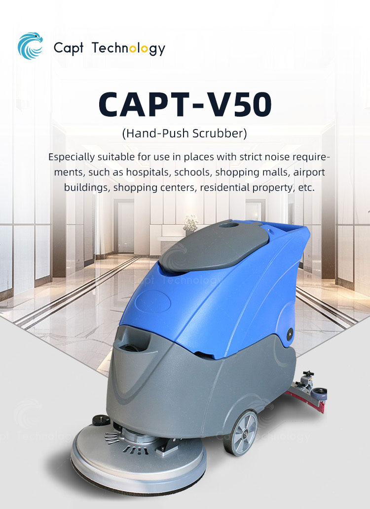 CAPT-V50 walk behind floor scrubber combines washing and drying, widely used in supermarket, government office, hospital, hotel, terminal building, subway platform and etc