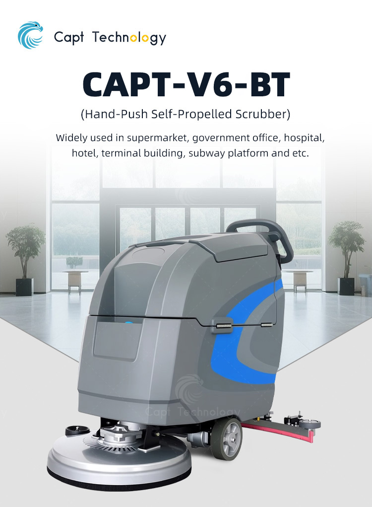 CAPT-V6-BT is an ergonomically designed hand-push self-propelled scrubber, it’s stylish and practical, easy to operate and low maintenance. The ground cleaning can be completed quickly during the use process, and the sewage can be automatically recovered at the same time of cleaning, realizing a practical and quick cleaning effect.