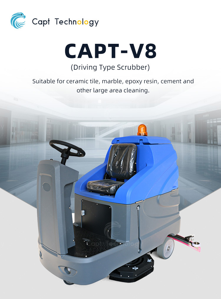 The ride-on floor scrubber CAPT-V8 is powerful, and capable of cleaning requirements in the industrial environment of heavy oil. Besides, it has enough compactness and flexibility to deal with the large area of cleaning task quickly and effectively. It is mainly used in shopping center, departure hall, factory and logistics warehouse.