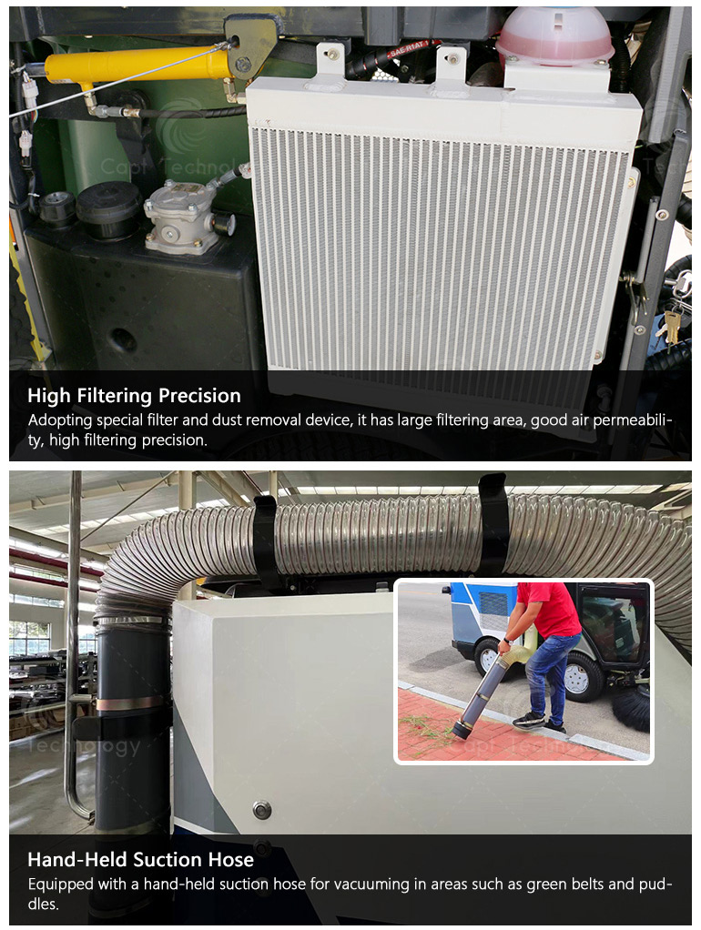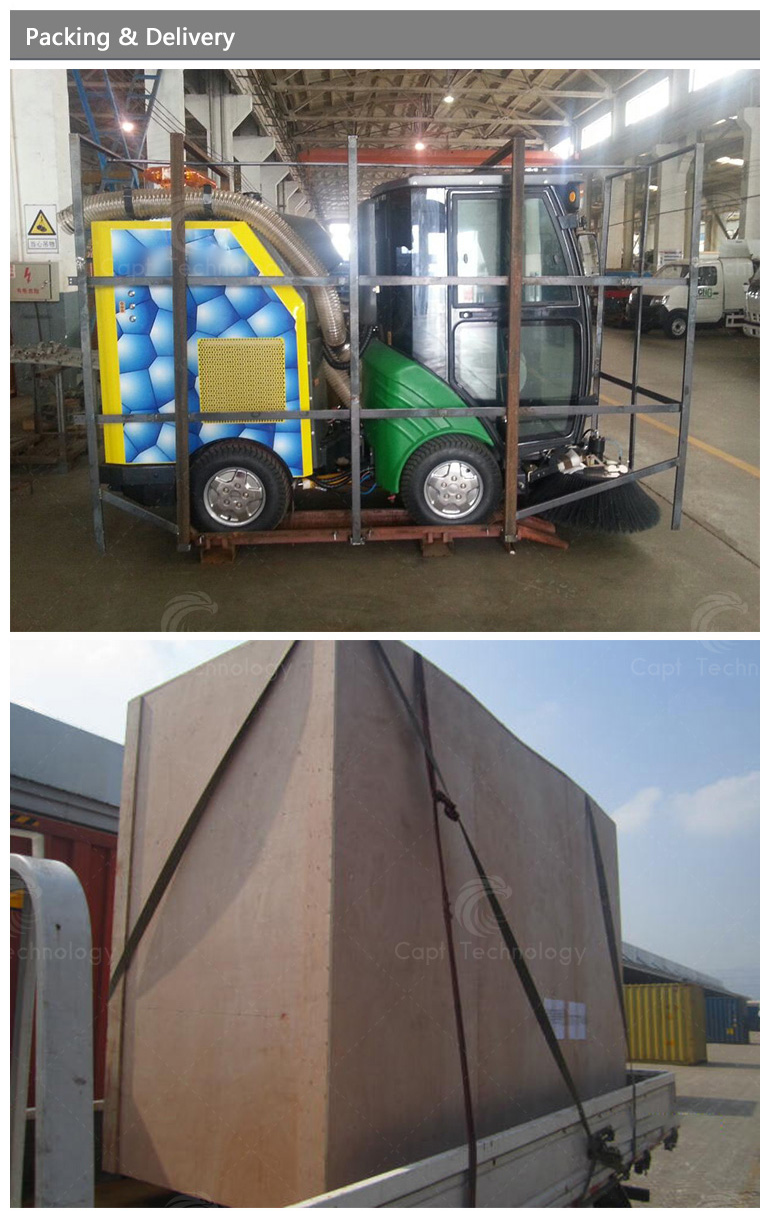 CAPT5021 diesel sweeper adopts single engine and driving by complete hydraulic, it is manufactured with advanced technology from famous company. The running of vehicle is flexible with the articulated turning. The standard 240L garbage bin is used to collect garbage and it is equipped with 150L clean water tank. The product fills black of the domestic small sweeper market. It is the minimal dry-wet sweeper, suitable for environmental protection, parking lot, footway and other street.