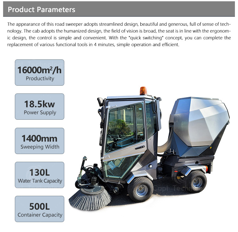 It’s widely used in cleaning work of urban roads, sidewalks, non-motorized roads, pedestrian streets, squares, parks, parking lots and other places. Especially suitable for narrow curved road cleaning.